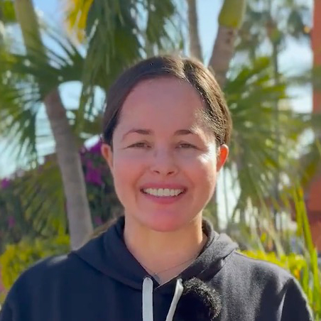 A woman wearing a black hoodie smiles outdoors with palm trees and greenery in the background.