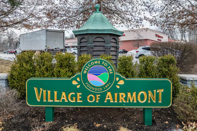 A green sign with "Village of Airmont" and "Welcome to the Village, Founded 1991" stands in front of bushes and a small gazebo-like structure. Cars and a Walgreens are visible in the background.