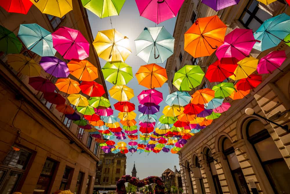 Colorful umbrellas hang suspended above a pedestrian street between two buildings, creating a vibrant canopy under a sunny sky.